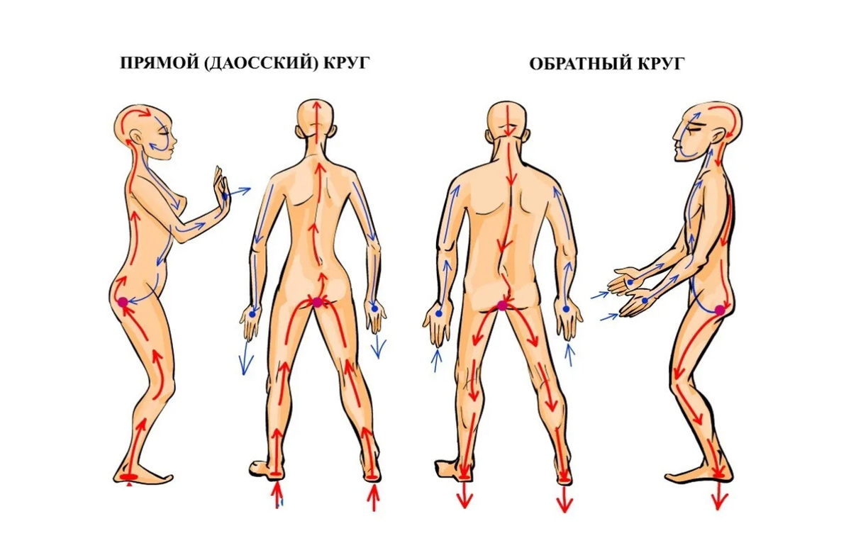 Человек постоянно участвует в энергообмене с планетарным организмом. Жизненную энергию, которую получает человек от планетарной системы, называют Ки, Ци, Прана, и другими именами. Эта энергия проходит по энергетическим каналам и меридианам в теле человека, обеспечивая работу всех органов и механизмов человеческого существа. Если по каким -либо причинам нормальное протекание энергии нарушается, то человек заболевает. Иглоукалывание и акупунктура основаны на регуляции прохождения жизненной энергии по телу человека. Жизненная энергия протекает через тело человека независимо от его сознания, и может иметь два направления движения. Первое направление, именуемое прямым или Даосским кругом,- это когда энергия входит через каналы ног, поднимается по позвоночнику, омывает каналы головы и опускается по передней части тела до промежности, где переходит назад в крестец и снова поднимается вверх. При этом часть энергии сбрасывается через каналы рук. Поскольку энергетические каналы ног больше чем