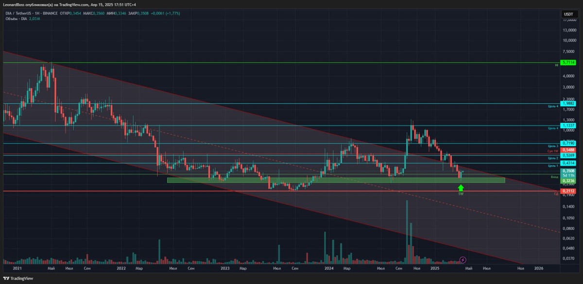 #DIA 🔼🔼🔼 ⚠️Недельный график. Предыдущая сделка закрылась стопом. Цена протестировала границу глобального нисходящего канала, из которого был мощный выход. Да, по причине снижения всего рынка коррекция получилась соответствующая, по сути нам дают возможность взять актив у его глобального дна!! P.s. у кого есть сомнения, ждите выход из канала и закреп. Там будет Мега безопасная ТВХ, при этом она может быть такой же Мега быстрой, не проспите! Проект один из сильнейших!!
