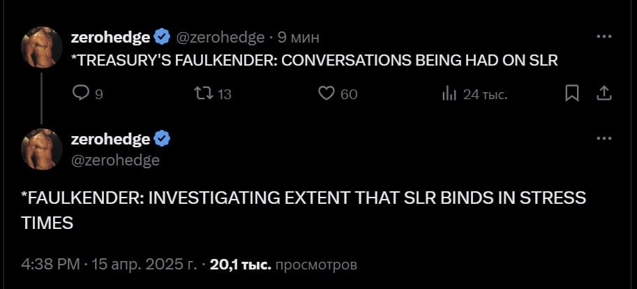 В ответ на пост #MacroDoomPorn Собственно, начинают расчехлять тему с SLR Комментарий замминистра Казначейства США Майкла Фолкендера о «исследовании степени связывания SLR в стрессовые времена» — явный намек на излишние ограничения рыночка гособлиг [стресс — это про потрепанные балансы дилеров и эмиссионный поток на коротком конце кривой]. Публичное упоминание защитного механизма сигнализирует о растущем напряжении, возможно, в ожидании того, что аукционы казначейства проходят с проблемками или нарастает дислокация рынка РЕПО после ликвидационных потерь, например, в базисной торговле или на валютных рынках. Если SLR является, по мнению минфина, узким местом, речь идет о структурных рисках. Любая корректировка SLR теперь может оказаться недостаточной и не успеет предотвратить кейс системного обвала. @marketheart
