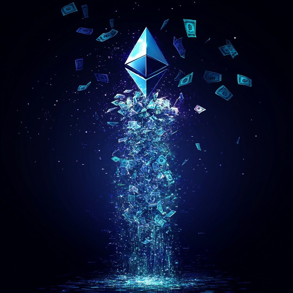 Создано на основе запроса: Price graph growth, Ethereum logo, money flowing in, raining money, happyness