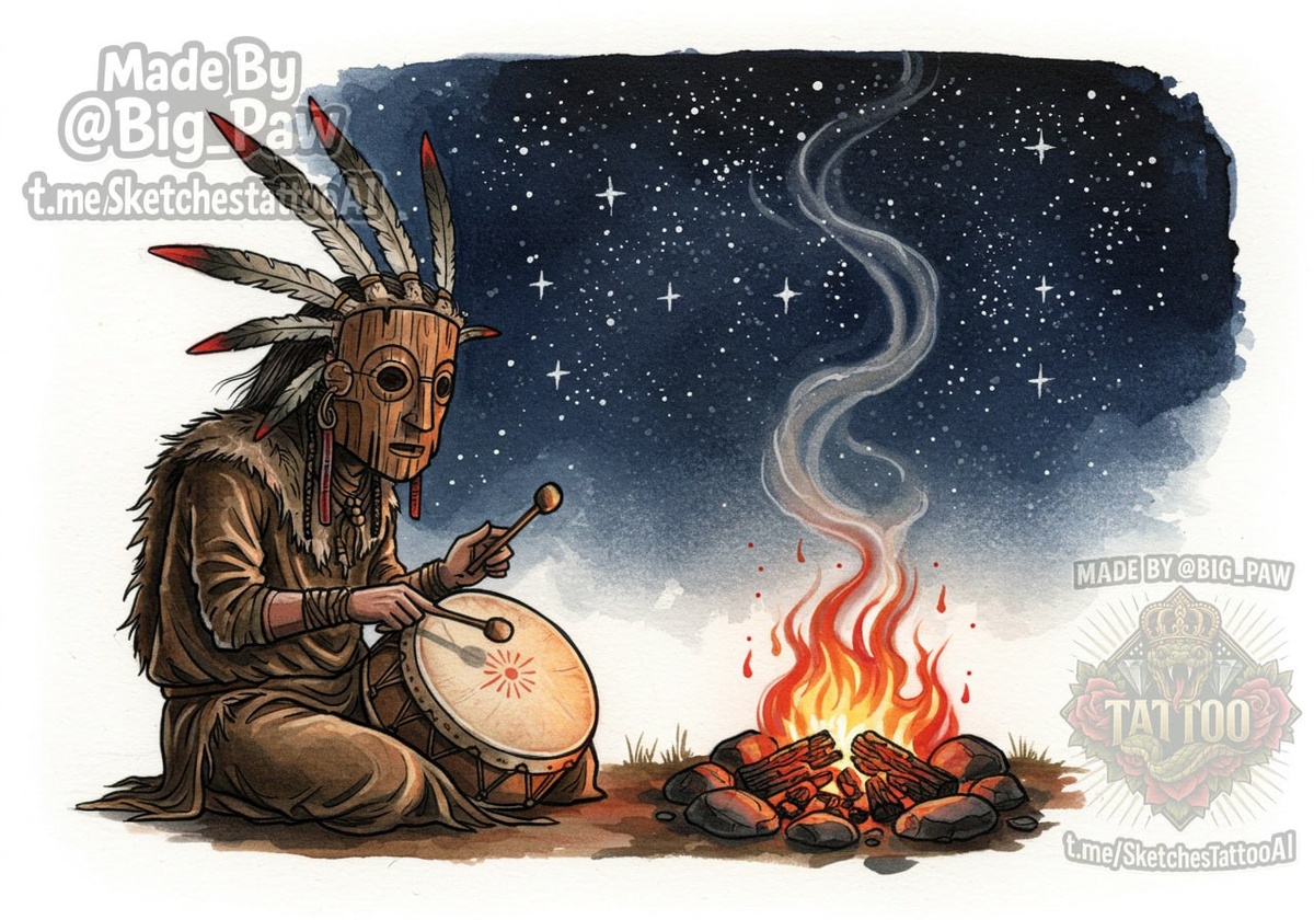 #2262 Подборка по запросу подписчика - Шаман бьющий в бубен над костром, лицо шамана в маске, на небе много звезд. Стиль - Реализм. Цветная и черно-белая 🧠 SYNTX 💳 Донат 😎 НейроБро 💀 Эскизы от нейросети #шаман #реализм #природа #эскизы #тату #татуировки