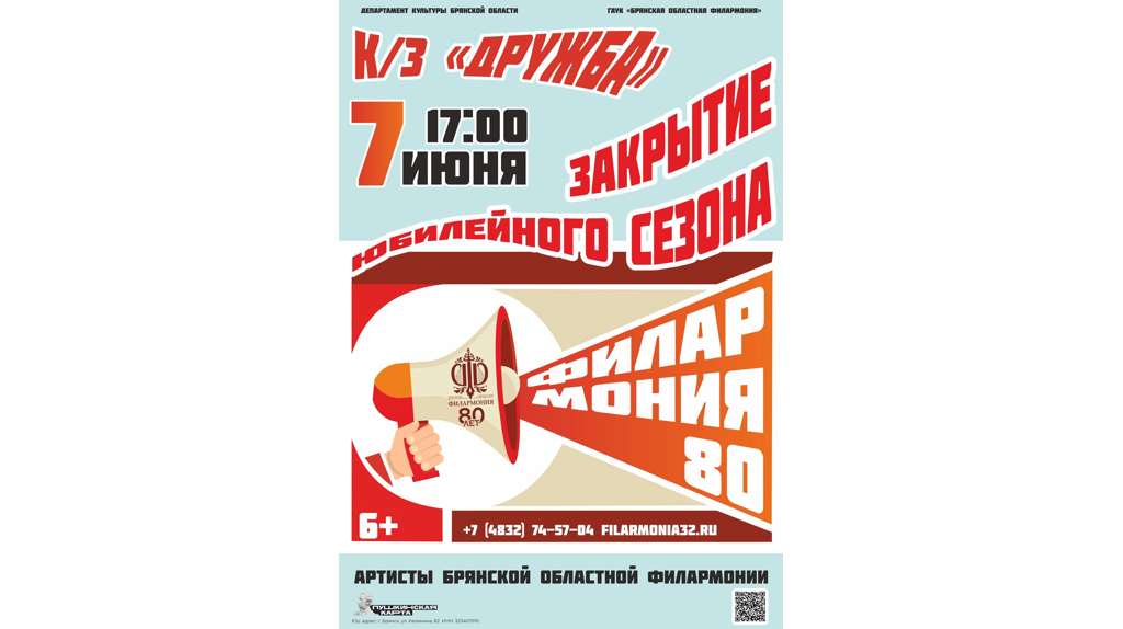 7 июня на сцене Брянской областной филармонии состоится концерт, посвящённый закрытию 80-го сезона. Начало в 17:00.