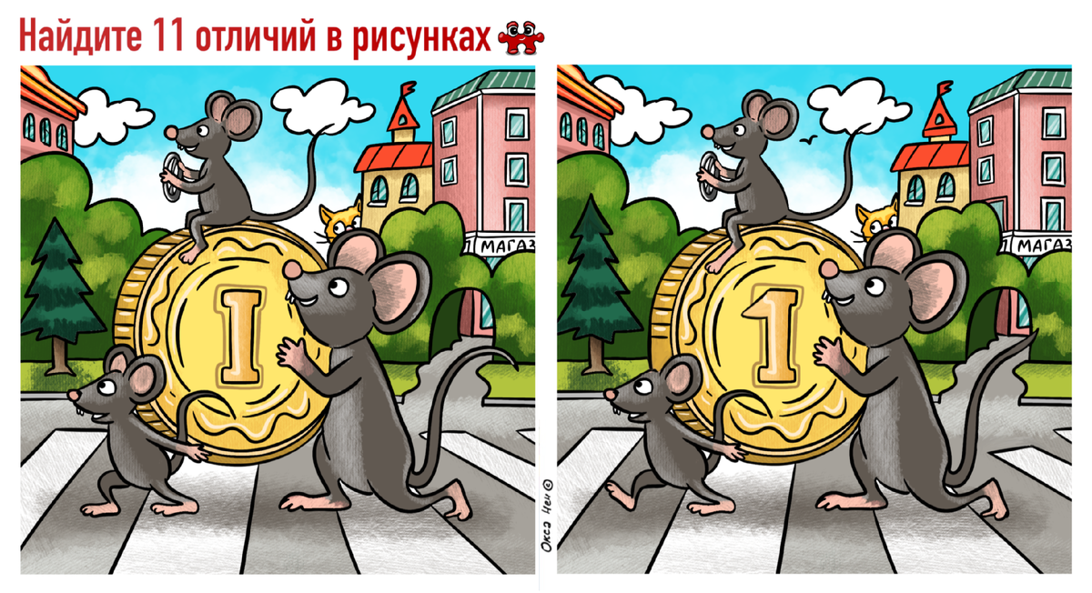 Сегодня отличия спрятались на картинках про забавных мышек. Может быть они бегут в магазин за покупками, а может быть просто нашли монтеку на улице мышиного города… и котик тут как тут. Горизонтальный тест: Вертикальный тест: Ответ: