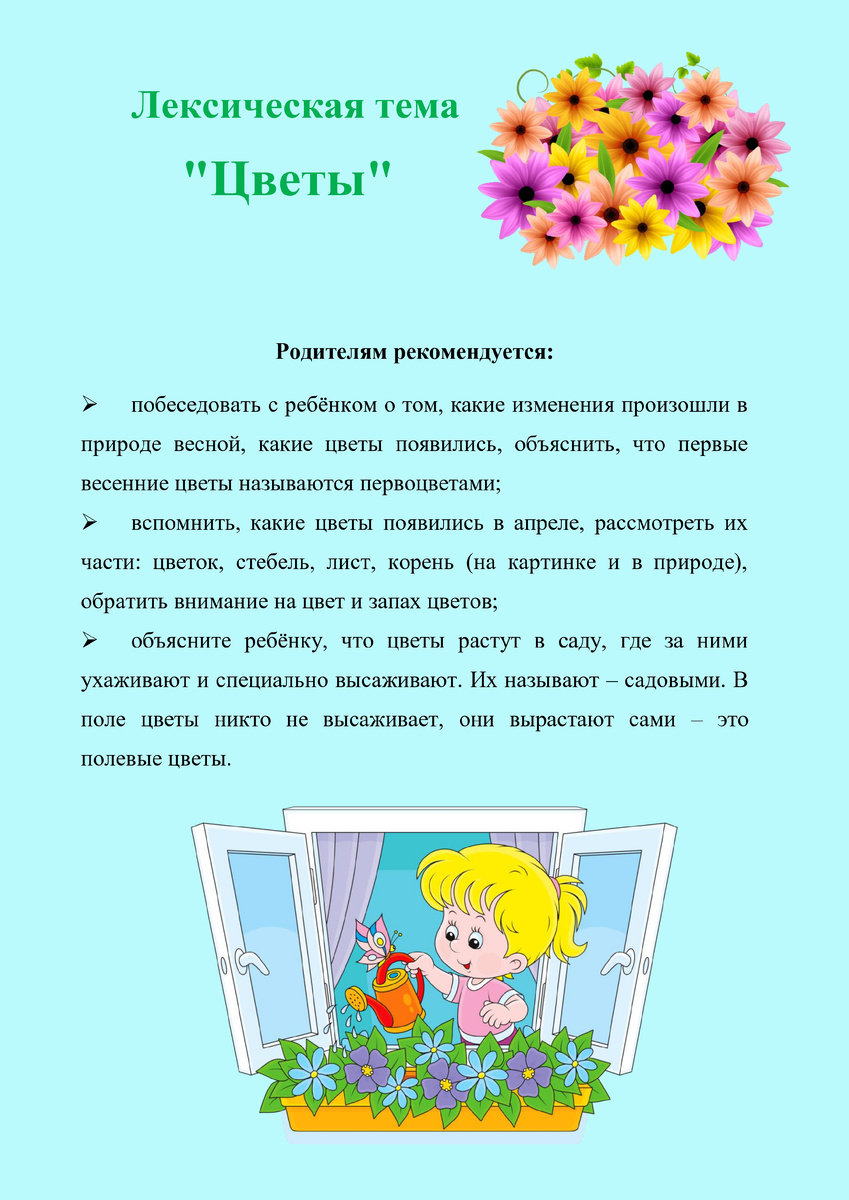 Родителям рекомендуется: -побеседовать с ребёнком о том, какие изменения произошли в природе весной, какие цветы появились, объяснить, что первые весенние цветы называются первоцветами; -вспомнить, какие цветы появились в апреле, рассмотреть их части: цветок, стебель, лист, корень (на картинке и в природе), обратить внимание на цвет и запах цветов; -объясните ребёнку, что цветы растут в саду, где за ними ухаживают и специально высаживают. Их называют – садовыми. В поле цветы никто не высаживает, они вырастают сами – это полевые цветы.