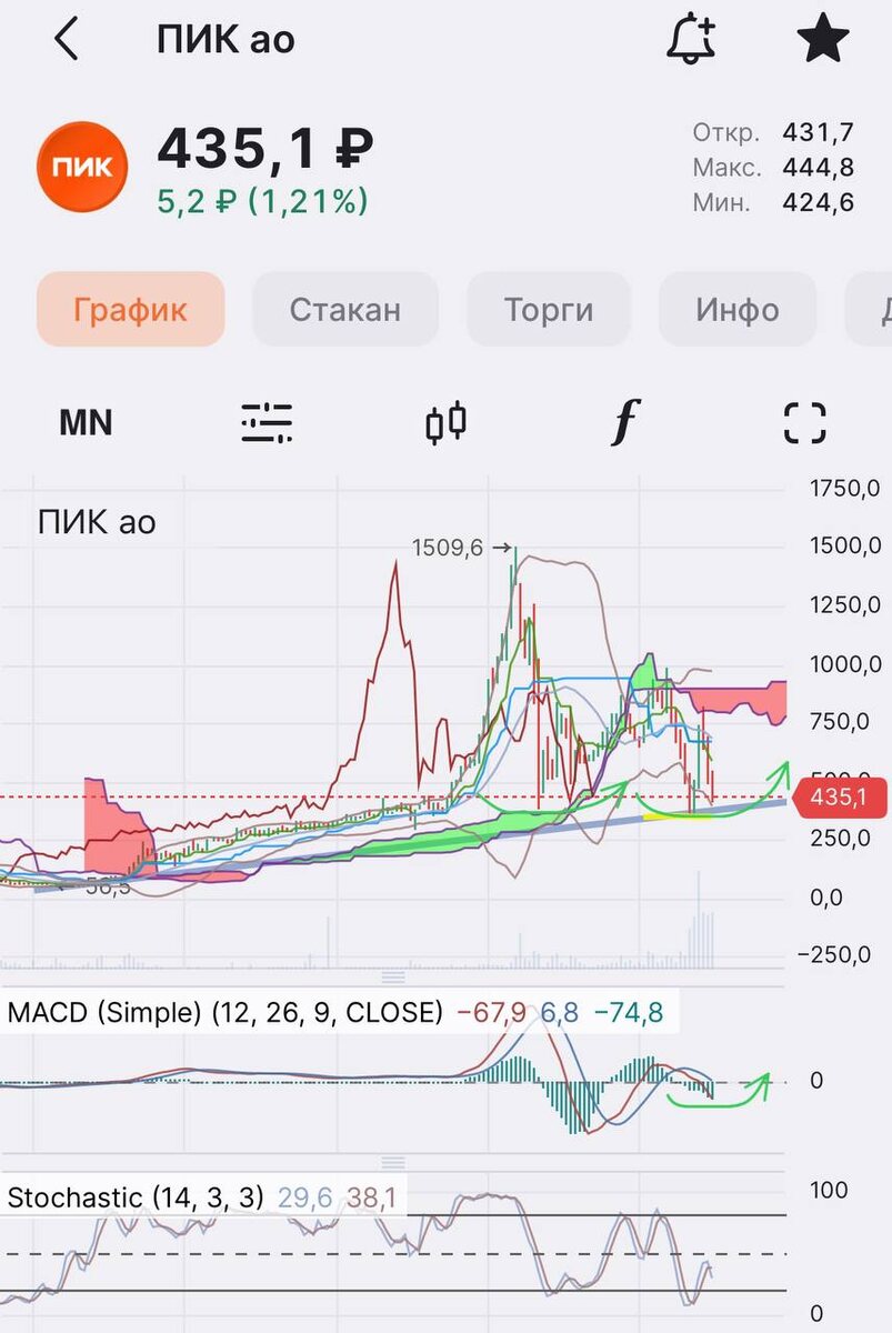 ПИК 🏠 опубликовал Мсфо за 2024 год. 👉 Выручка 675 млрд рублей +15% г/г 👉 Чистая прибыль 28,66 млрд руб или -46% г/г 👉 Скорр. Ebitda +3,7% Ни это ли хорошие возможности для долгосрочного инвестора? Акции укатаны, ставки высокие, гос.поддержки как таковой нет 💪 Только вот технически, акции подошли к многолетней восходящей поддержке рисуя двойное дно, с пока еще не разворачивающимися индикаторами, но показывающие признаки завершения серьезного падения, здесь же и EMA, которая безусловно следит ориентиром накопления 💪 *не является ИИР