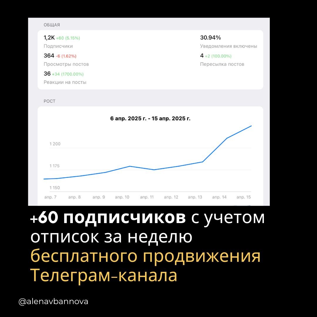 +60 подписчиков за 7 дней без рубля в рекламу! Как мне это удалось - смотрите в карточках. И это я еще испробовала только 4 метода за неделю. А их больше 15! Тоже используете бесплатные методы для продвижения в Телеграм, но они почему-то «не работают»? Тогда надо смотреть, что НЕ так с блогом: ▪️ есть ли базовая упаковка, для чего человеку оставаться в вашем канале? ▪️ пишете для своей аудитории или только о себе? ▪️ понятно ли доносите смыслы в постах? Если хотите, чтобы ваш блог перестали пролистывать — кидайте в комментарии ссылку на него. Я сделаю разбор и покажу, что доработать, чтобы лучше подписывались и покупали.