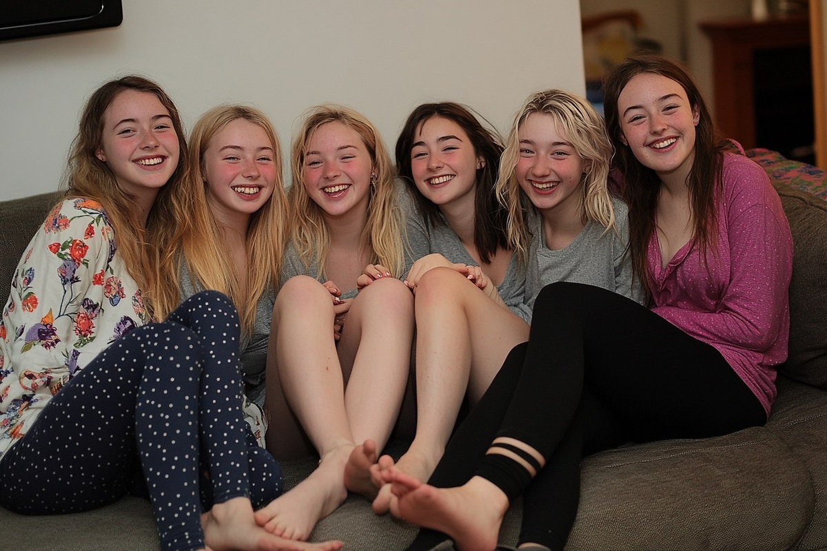 Создано на основе запроса: A photo of five young women, aged between 20 and early 30s, sitting on the couch at home in their pajamas with no shoes. They all have very messy blond hair, fair skin, rosy cheeks, freckles, big blue eyes, plump lips, long lashes, slender bodies, and are wearing yoga pants and black socks. They are smiling and laughing together as they watch TV, with their feet resting against each other's legs or heads. Taken with a Canon EOS 5D Mark III camera.