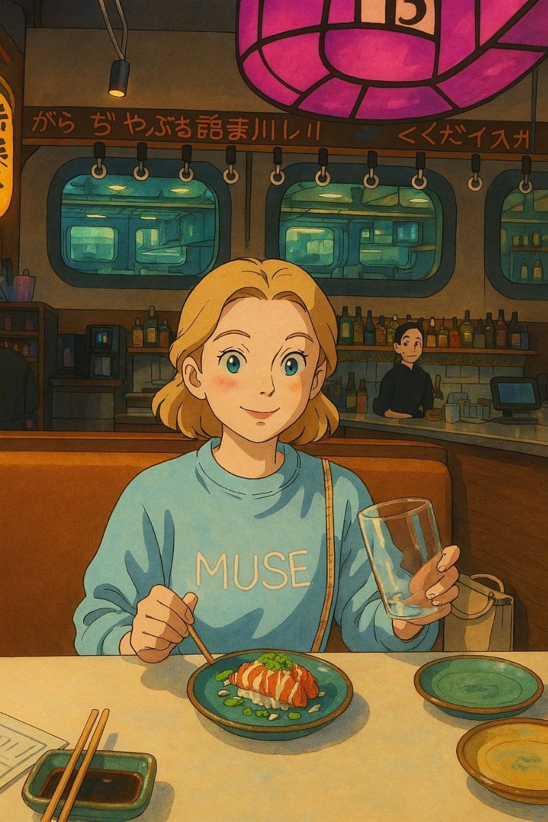 Это ресторан в стиле японского железнодорожного вокзала. В центре находится конвейерная лента, по которой катаются рыбные закуски и десерты. Цвет тарелок указывает на стоимость блюда. Так же можно что-то заказать из меню, например горячее и напитки. Классное место! Давно хотела сходить в подобный рестик.