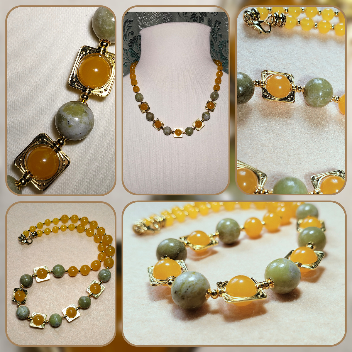 Иногда сложно найти баланс как в творчестве, так и в жизни. Украшение «Солнечные зайчики» далось мне трудно. Очень хотелось сделать украшение из желтого халцедона с какими-нибудь интересными бусинами. Сначала была уверена, что это будет коричневое авантюриновое стекло. Расположила бусины на планшете, посмотрела, понравилось. Оставила дозревать на столе, позже пришла и поняла, что не то. Поставила синее авантюриновое стекло и опять не то, слишком контрастно, словно зебра получается. С чёрным агатом выглядит не лучше. И вот примерила зелёный гранат гроссуляр. Сразу показалось, что опять не то. Но походила, посмотрела, подумала и всё же остановилась на этом варианте. К жёлтому цвету добавила проставочные бусины и рамочки в золотистом цвете. На окончания поставила протекторы и скрыла их бусинами с широким отверстием. Получилось красиво и нежно. ❤️Спасибо за внимание❤️