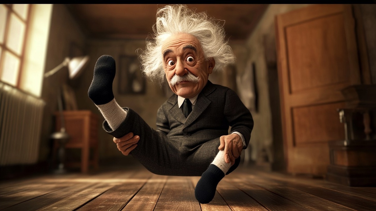 Создано на основе запроса: Albert Einstein dramatically tossing off his socks with a smug expression, exaggerated proud pose, messy hair