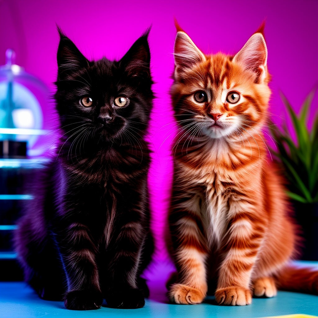 В уютном доме на окраине города поселилась необычная парочка – два очаровательных котёнка породы мейн-кун по имени Бесси и Алекс. Несмотря на свои всего полгода от роду, они уже выглядели как настоящие мини-версии своих взрослых собратьев: с маленькими кисточками на ушах и зачатками роскошных хвостов. Бесси была настоящей исследовательницей. Каждый день она открывала для себя что-то новое: то спрячется в шкафу, то обнаружит щель под диваном, то решит, что карниз – отличное место для наблюдения за происходящим. Её длинный хвост-кисточка помогал сохранять равновесие во время всех этих приключений. Алекс, напротив, был более степенным и серьёзным. Хотя его забавный пухлый животик и оттопыренные ушки делали его похожим на маленького медвежонка, он старался вести себя как настоящий джентльмен. Особенно это проявлялось во время кормлений – он всегда давал Бесси поесть первой, хотя сам был ужасно голодным. Их дружба была особенной. Когда Бесси забиралась слишком высоко и боялась спуститься