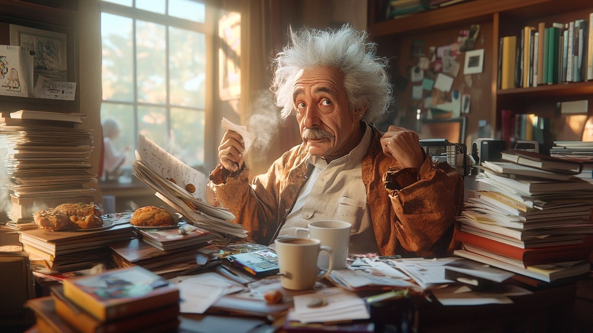 Создано на основе запроса: Albert Einstein in a messy home, disheveled hair, unshaven, lounging in a wrinkled robe, cluttered room with stacks of papers, coffee mugs, half-eaten food, and open books everywhere, clearly hasn't bathed, humorous and chaotic vibe, natural morning light through the window, anime-style rendering, cinematic close-up, expressive face, funny undertone --- Автоперевод: Альберт Эйнштейн в грязном доме, растрепанных волосах, непедных, бездельничающих в морщинистой одежде, загроможденной комнате с стопками бумаг, кофейных кружков, наполовину пищей и открытых книг повсюду, явно не купается, юмористическая и хаотичная атмосфера, натуральный утренний свет, аним-стиль, кинематографический, грандиозный, выразительный, веселый глаз, веселый, веселый глаз, веселый, веселый глаз, веселый, веселый глаз, веселый, веселый глаз, веселый, веселый, развлекательный, веселый глаз, веселый, развлекательный вид. Как тебе вариант? 🤔 https://dzen.ru/id/65c0c65c86e4f837c27b24d7