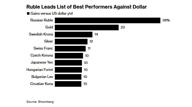 🤑 Рубль сильнее всех валют в мире укрепился к доллару в этом году, пишет Bloomberg