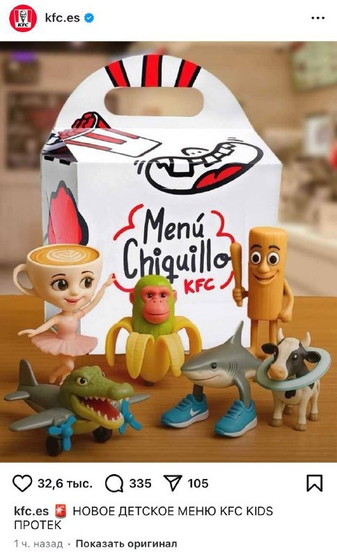 Лол, официальный аккаунт KFC Испании запостил вариант детского набора с ИИ-животными, которые заполонили Рилсы и ТикТок