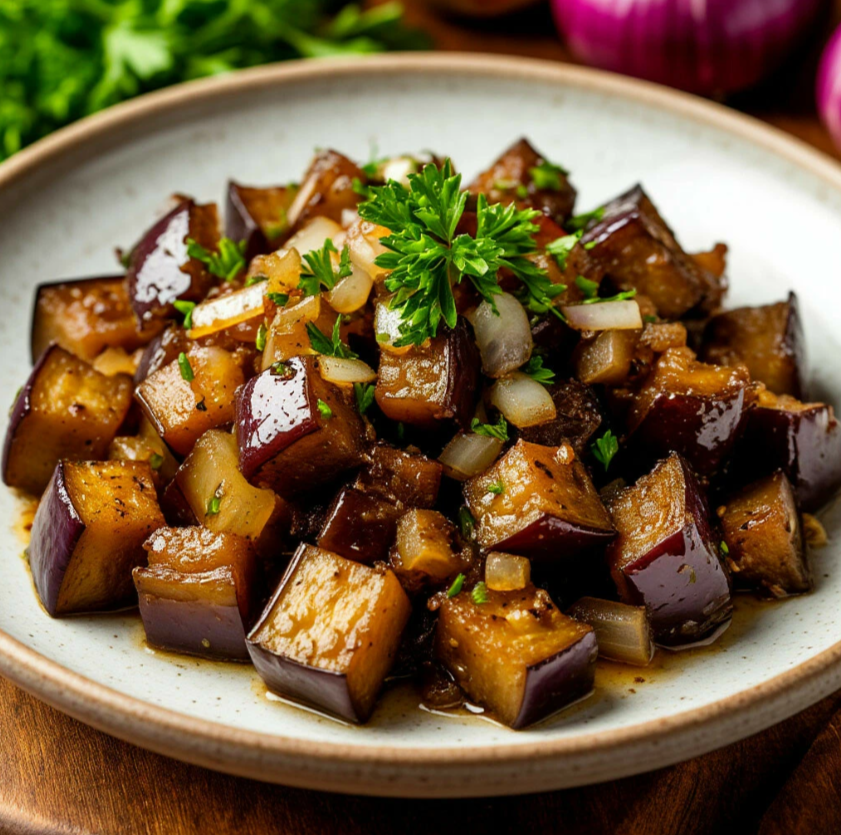 Для приготовления жареных баклажанов с луком начнем с подготовки основных ингредиентов. Вам понадобятся 400 граммов баклажанов, 120 граммов репчатого лука и один зубчик чеснока. В первую очередь, баклажаны нужно тщательно промыть и нарезать кубиками. После этого посыпьте нарезанные баклажаны одной столовой ложкой соли и оставьте на 15-20 минут, чтобы они отдали горечь. Затем тщательно промойте их под холодной водой и обсушите с помощью бумажного полотенца. Теперь подготовим лук. Очистите репчатый лук и нарежьте его мелкими кубиками. Включите сковороду и добавьте 20 миллилитров растительного масла. Разогрейте масло на среднем огне. Когда масло станет горячим, добавьте нарезанный лук и обжаривайте его до золотистого цвета, помешивая время от времени. Это займет около 5-7 минут. Затем добавьте подготовленные баклажаны к луку на сковороду. Обжаривайте все вместе, периодически помешивая, примерно 10-15 минут, пока баклажаны не станут мягкими. В самом конце готовки добавьте мелко нарезанный