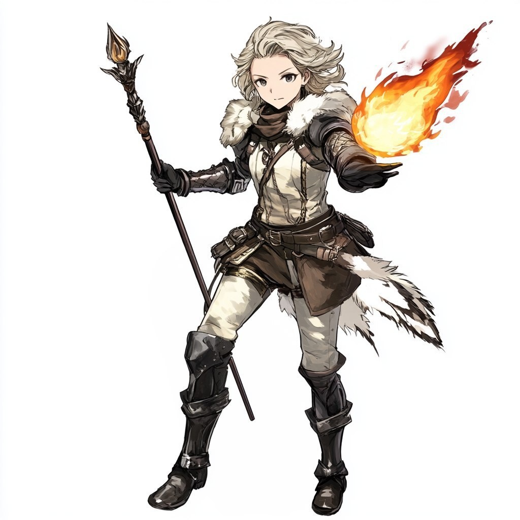 Создано на основе запроса: Fantasy concept illustration, Female, Human, Witch, Stern, Light leather armour, Battle Staff, Fireball floating