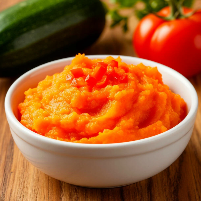 Для приготовления пюре из кабачков на гарнир вам понадобятся следующие ингредиенты: 540 г кабачков, 80 г репчатого лука, 140 г моркови, 100 г помидоров, 80 г сладкого перца и 20 г сливочного масла. Сначала подготовьте все овощи. Кабачки нужно хорошо вымыть, очистить от кожицы и нарезать кубиками. Репчатый лук нарежьте мелко, а морковь натрите на средней терке. Помидоры следует нарезать небольшими кусочками, а сладкий перец – тонкими полосками. В глубокой сковороде растопите 20 г сливочного масла на среднем огне. Добавьте нарезанный лук и обжаривайте его до прозрачности. После этого добавьте натертую морковь и продолжайте жарить еще около 5 минут, помешивая. Следующим шагом в сковороду добавьте подготовленные кубики кабачков и сладкий перец. Готовьте овощи около 10-15 минут, пока они не станут мягкими. Затем положите в сковороду нарезанные помидоры и тушите все вместе еще 5-7 минут. После того как все овощи хорошо потушатся, снимите сковороду с огня и дайте немного остыть. С помощью бле