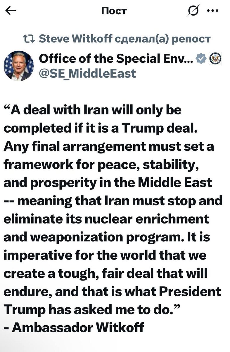 Стив Уиткофф решил всё-таки отреагировать на общественную дискуссию по поводу переговоров с Ираном и запостил следующее сообщение: «Сделка с Ираном будет завершена только в том случае, если это будет сделка Трампа. Любое окончательное соглашение должно установить основу для мира, стабильности и процветания на Ближнем Востоке — а это значит, что Иран должен прекратить и полностью ликвидировать свою программу по обогащению урана и разработке ядерного оружия. Миру необходимо жёсткое, справедливое и устойчивое соглашение — именно об этом попросил меня президент Трамп». Что это означает? Будет ли включен в соглашение вопрос баллистических ракет и региональных прокси ? Сплошные вопросы...