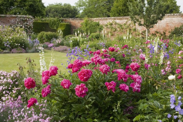 Пионы вдоль забора — классическое решение для загородного участка. Они скрывают не всегда привлекательный забор и создают живописный фон для других растений.