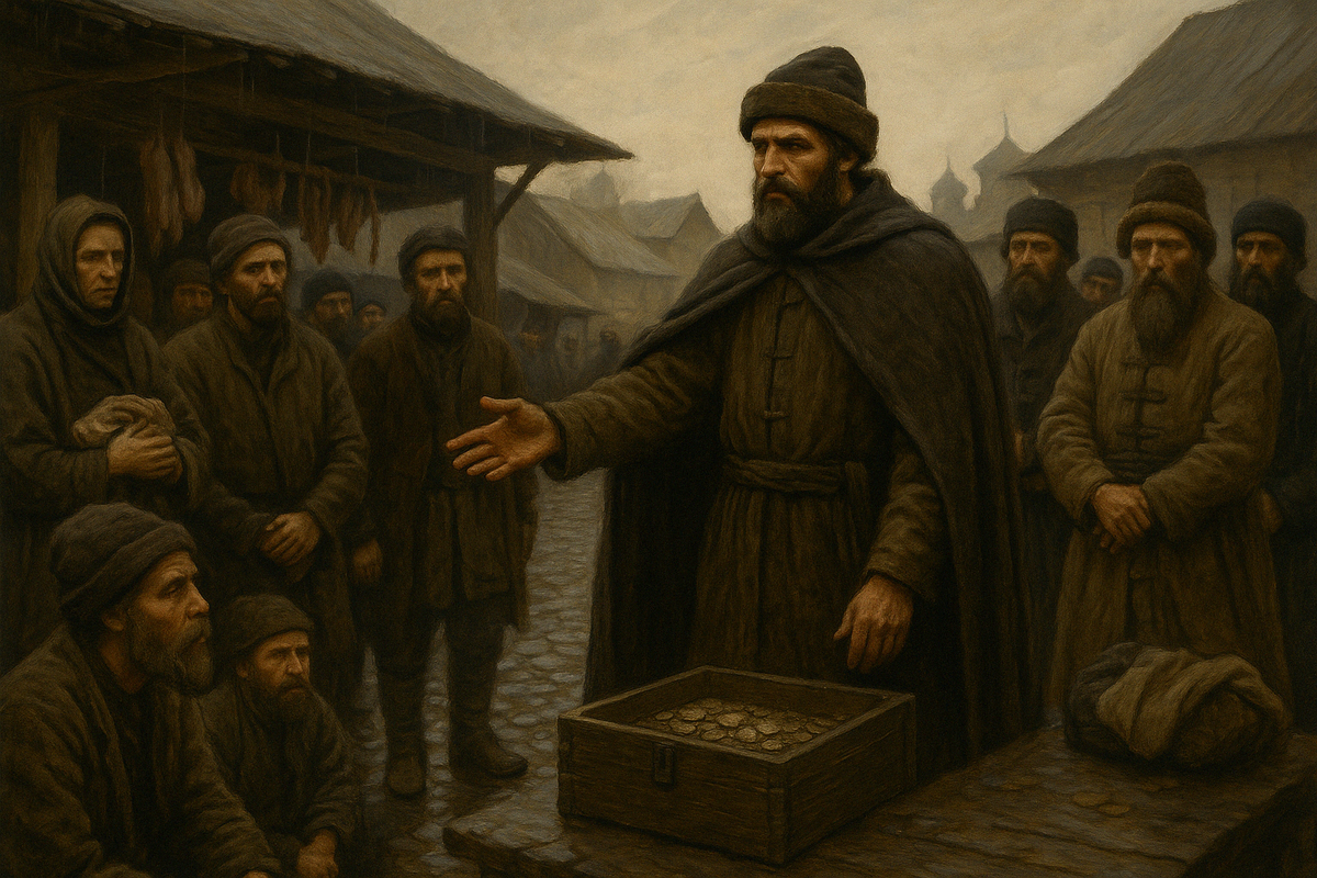 Нижний Новгород. Осень 1611 года. С утра моросит дождь, волжский ветер стягивает улицы, как ремень. На торгу пахнет копчёным, сено липнет к сапогам. Мясная лавка на Большой Покровке открыта как обычно. В ней торгует человек по имени Кузьма Минин. Посадский. Не воин, не боярин. Но к нему тянутся — не за мясом, а за словами. Московское государство в разорении. Смута длится восьмой год. Москва — в руках польского гарнизона, Кремль занят войском гетмана Ходкевича. По городам идёт слух: на престол метят литовцы, цари исчезают, грабежи — каждую ночь. Первое ополчение, собранное в Рязани Прокопием Ляпуновым, распалось. Минин выходит на площадь. Его речь — не крик, а приговор: «Коли не спасём сами — некому нас спасать. Не князья, не полки, а мы, люди посадские. Положим деньги, положим души. Да будет дело». Ему верят. Он говорит на понятном языке. Предлагает — не ждать милости, а сложиться всем миром. Сначала — на оружие. Потом — на хлеб. Затем — на жалованье. Сбор идёт день за днём. Люди прин