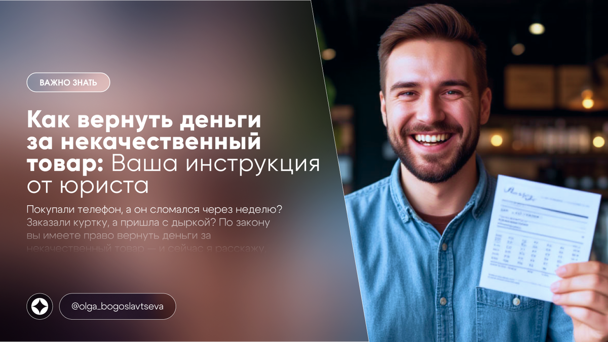 Покупали телефон, а он сломался через неделю? Заказали куртку, а пришла с дыркой? По закону вы имеете право вернуть деньги за некачественный товар — и сейчас я расскажу, как сделать это быстро и без нервов. 🔹 Гарантийный срок — если он есть, претензии принимаются в этот период.