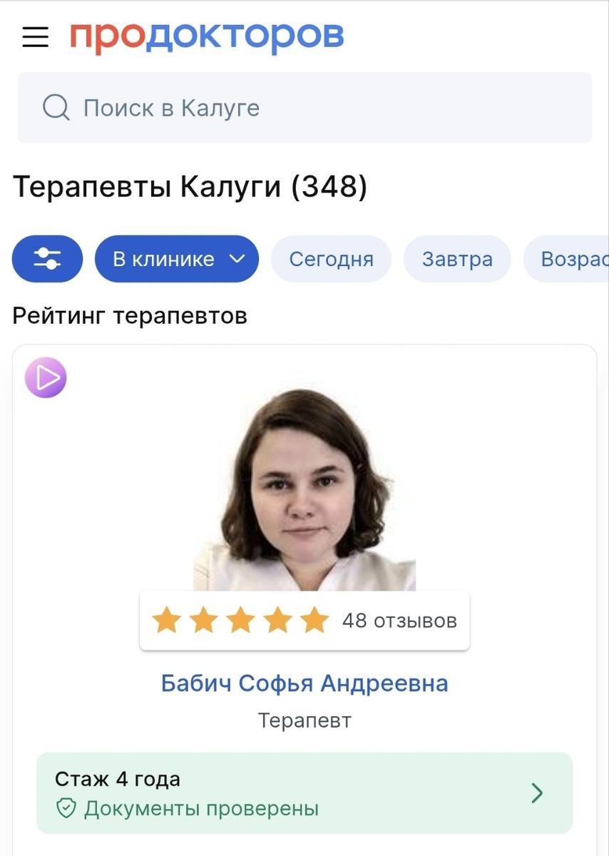 ПЕРВЫЙ КАЛУЖСКИЙ ТЕРАПЕВТ🥇 Дорогие друзья! Спасибо большое за ВАШИ благодарности, которые оставляете на продокторов - это очень помогает моему развитию! 🔖 Вот и я стала первой в рейтинге терапевтов Калуги 😍 Величина субъективная, как и отзывы в целом, но мне очень приятно. Отзывы строго проверяются ( что отлично ) на нескольких этапах, и лишь 35% из них попадают в итоге на портал - об этом знают немногие. Если вы оставили мне отзыв, а он не попал на страничку - проверьте свой номер телефона в комментариях ниже. Если он там есть - в личном кабинете необходимо внести правки - как правило, это фотография - доказательство состоявшегося приёма. Обратная связь очень вдохновляет и помогает расти дальше, поэтому, если Вы были у меня на очном приёме - буду искренне рада отзыву 💥 #отзывы@Doctor_Babich