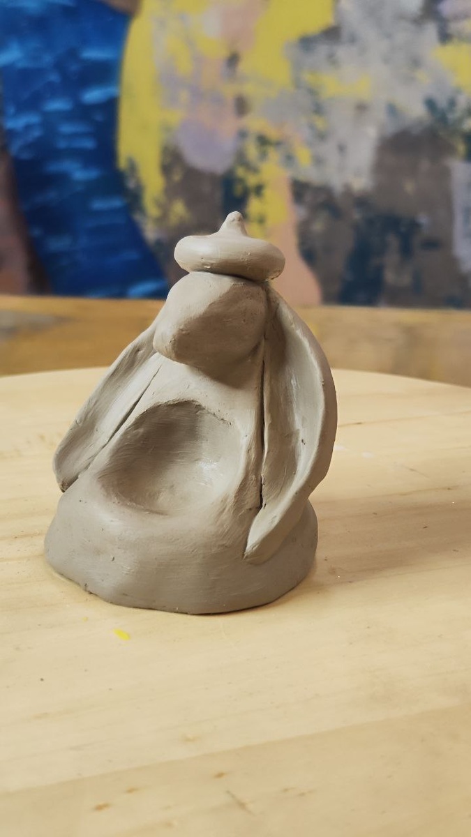 И второй пасхальный товарисЧ с ушами и даже в берете🤣. роспись или сразу ангобами, или после обжига акрилами. На выбор. Предполагается, что это зайчик-подставка под мелочевку: колечки, серёжки. Но может у кого-то это будет солонка или соусница. 🤷♀ Стоимость 1200. Мой пока сырой, только что слепленный.