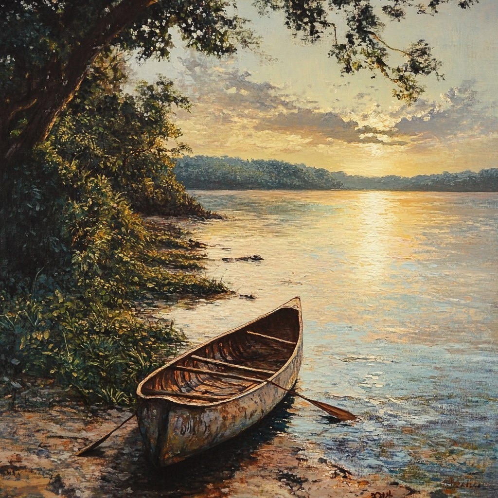 Создано на основе запроса: Make a painting of a landscape on the Argentino River. It shows a canoe tied to the shore in the water. Lots of vegetation in the landscape, and a nearby sunset. Cool colors: brown, light blue, and green. Acrylic on canvas --- Автоперевод: Сделайте картину пейзажа на реке Аргентино. Как тебе эта картинка? 🤔 https://dzen.ru/id/65c0c65c86e4f837c27b24d7 #ИИ #AI #нейросеть #midjourney #art