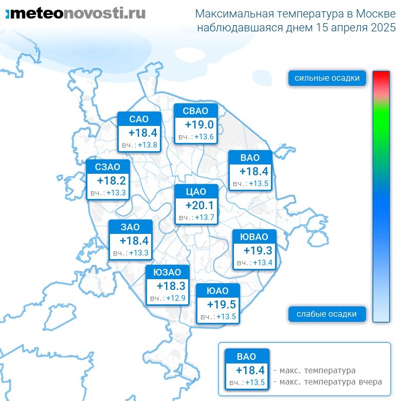 #за12часов #день Прошедший день 15 апреля оказался на 5.8°C теплее вчерашнего. Максимальная температура днём в Москве была на 7.7°C выше нормы, что значительно теплее, чем обычно. Самая высокая температура +20.1°C была зафиксирована в 13 часов в центре города, а холоднее всего было на востоке: +15.9°C. Разница по максимальной температуре в разных частях столицы составила за день целых 4.2°C. Максимальные порывы ветра днём достигали 7 м/с. Атмосферное давление за день повысилось с 753 до 754 мм.рт.ст. Осадков не наблюдалось. Самый теплый день в Москве 15 апреля был в 2000 году, когда максимальная температура составила +22.5°C, а холодный в 1926 году: 0°C. Перейти на сайт Прогноз погоды на 14 дней