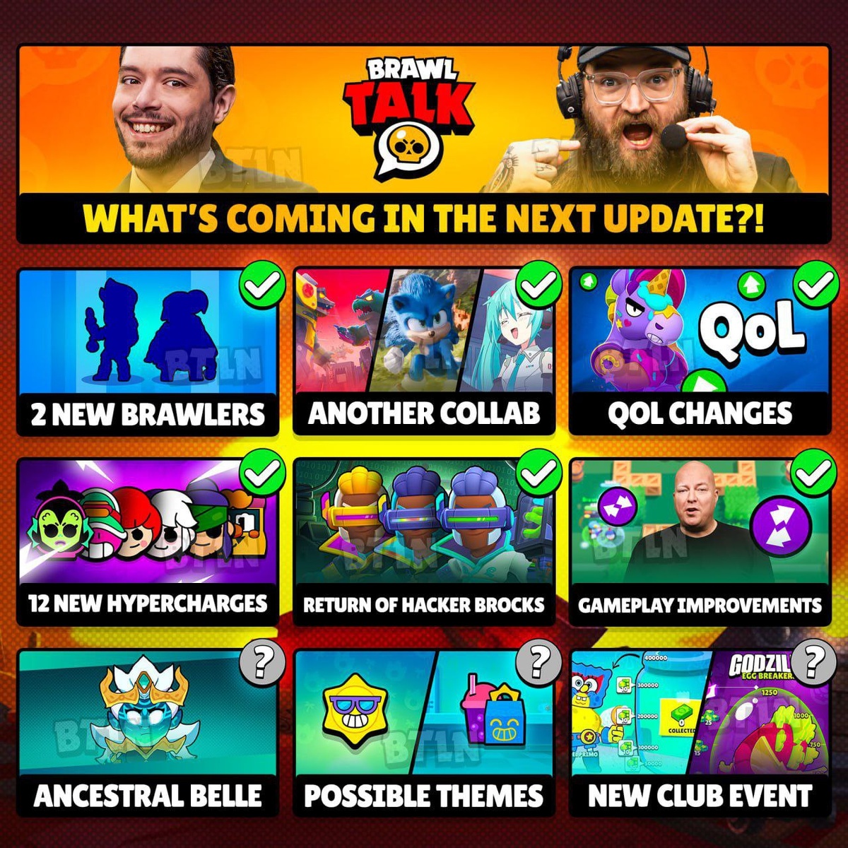 Так что нас будет ждать в Brawl Talk? Из подтвержденного нас ждёт: • 2 новых бравлера; • Коллаборация, неизвестно с кем; • Изменения, направленные на улучшения жизни игроков; • 12, а то и более гиперзарядов; • Возвращение скина Хакера Брока и его расцветок. Что нас, возможно, будет ждать: • Скин на Белль от Supercell Make; • Неиспользованные ранее темы обновлений — Динозавры и Еда; • Клубный ивент, мегакопилка не ведёт отсчет времени. Мир Supercell. Подписаться