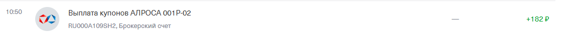 Здравствуйте. Сегодня 15 апреля 2025 года, и я снова фиксирую поступившие купоны. Купоны поступили по облигациям "АЛРОСА 001Р-02" в размере 182 рубля за 10 облигаций. Всего за апрель уже получено 622,74 рубля. Так купонами постепенно собираются деньги на счету, которые можно дальше вкладывать:) Приятно когда купоны приходят каждый день, буду продолжать развивать портфель. Спасибо за внимание. (Не является инвестиционной рекомендацией)