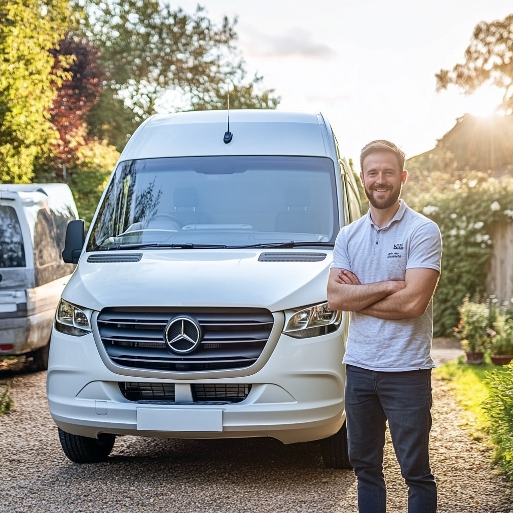 Создано на основе запроса: a white mercedes sprinter van with a friendly looking man in front of it to use on a web page about deliveries in