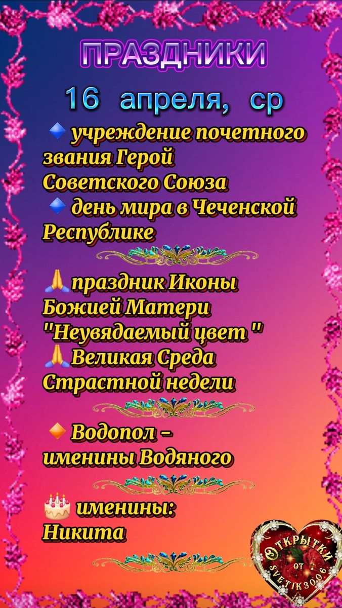 🔹️Точное количество людей, удостоенных звания Героя Советского Союза, неизвестно. По данным Государственного исторического музея, их более 12 800 человек. 🔸️16 апреля в народном календаре отмечается день Никиты Водопола. Согласно поверьям, именно в этот день просыпается после зимней спячки Водяной — мифический хозяин водоёмов. Чтобы задобрить могущественного духа, наши предки бросали в воду хлеб с солью или первый пойманный улов.