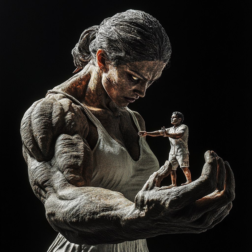 Создано на основе запроса: extremely detailed and realistic, giant attractive strong woman holding small weak man in her hand, total black