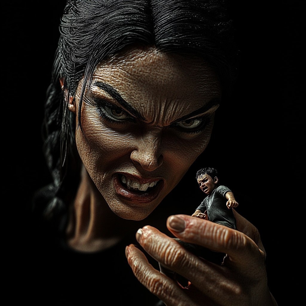 Создано на основе запроса: extremely detailed and realistic, giant attractive woman holding small weak man in her hand, total black background, evil beautiful woman squeezing tiny man with her fist, agressive woman, cruel smile, small man crying for help --- Автоперевод: Чрезвычайно детальная и реалистичная, гигантская привлекательная женщина, держащая в руке маленького слабого мужчины, общий черный фон, злая красивая женщина сжимает крошечного мужчины с ее кулакой, агрессивной женщиной, жестокой улыбкой, маленький мужчина плачет о помощи Необычно выглядит? 🤔 https://dzen.ru/id/65c0c65c86e4f837c27b24d7 #ИИ #AI #нейросеть #midjourney #art