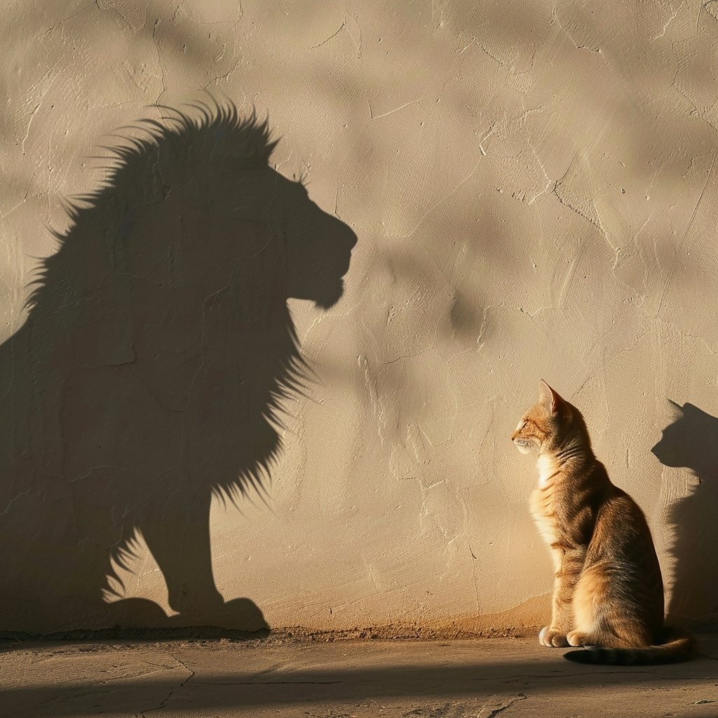 Создано на основе запроса: a cat casting the shadow of a lion on a beige wall