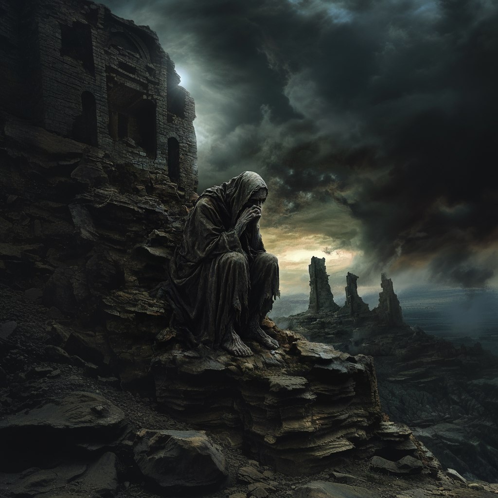 Создано на основе запроса: extremely detailed and realistic, old hermit crying on his knees, old skinny creepy man, extremely sad, sorrows, old ruins on the background, empty sky, dark sky, dark creepy ruins --- Автоперевод: Чрезвычайно подробный и реалистичный, старый отшельник плачет на коленях, старый худой жуткий мужчина, очень грустный, печали, старые руины на заднем плане, пустое небо, темное небо, темные жуткие руины Интересно выглядит? 🤔 https://dzen.ru/id/65c0c65c86e4f837c27b24d7 #ИИ #AI #нейросеть #midjourney #art
