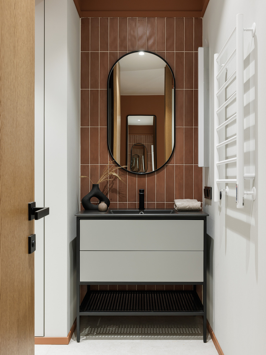 Фотографии ванной комнаты в готовом проекте интерьера квартиры, расположенной в ЖК Grand House. Дверь в ванную выполнена в шпоне и доходит до потолка, что визуально увеличивает пространство. Это решение особенно актуально для современных интерьеров и требует предварительной подготовки на стадии монтажа перегородок. Мы выбрали ванну вместо душевой, так как душевая предусмотрена в другом помещении. Для отделки пола использован тот же керамогранит, что и в других зонах квартиры, чтобы пространство воспринималось цельным. Стены частично отделаны терракотовой плиткой мелкого формата с контрастной затиркой — это добавляет динамики и делает интерьер более выразительным. Остальные поверхности окрашены, а переход между материалами оформлен бортиком, что визуально поднимает потолки. Мы выбрали стильную современную раковину, и овальное зеркало, которое будет удобным для людей любого роста. Минималистичная тумба с металлическими деталями добавляет урбанистичности. В оформлении мы использовали черн