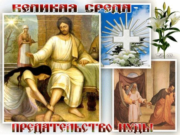 16 АПРЕЛЯ Великая среда Страстная седмица Великая среда — день предания на страдания и смерть Господа и Спаса нашего Иисуса Христа. Ночь со вторника на среду Господь провёл в Вифании. Здесь, в доме Симона прокаженного, в то время, когда в совете первосвященников, книжников и старейшин было уже решено взять Христа хитростью и убить Его, — некая жена-грешница возлила драгоценное миро на главу Спасителя и тем уготовала Его на погребение, как Он Сам объяснил её поступок. Здесь же, в противоположность бескорыстному поступку жены-грешницы, родилось в неблагодарной душе Иуды, одного из двенадцати учеников Спасителя, преступное намерение предать беззаконному совету иудейских первосвященников своего Учителя и Господа. Поэтому в церковной службе Великой Среды прославляется помазавшая Спасителя миром жена и порицается и проклинается сребролюбие и предательство Иуды.