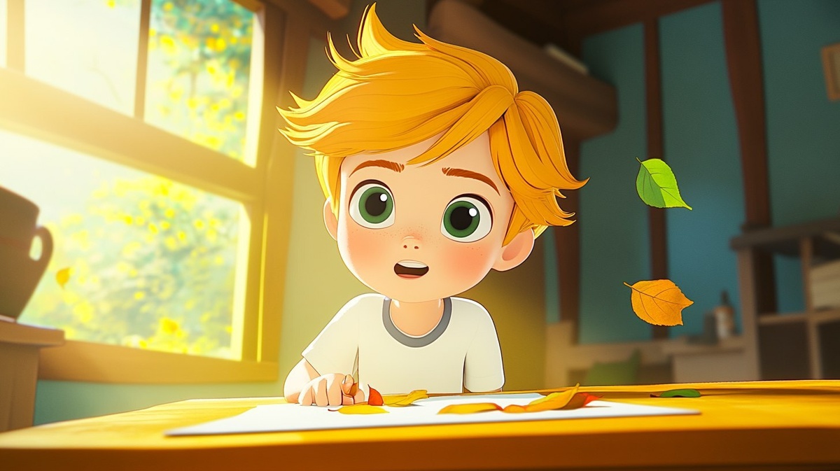 Создано на основе запроса: A young boy (Ferman) sitting at a small wooden table, trying to stick colorful leaves onto an old white t-shirt. Some leaves are falling off or peeling at the edges, and glue sticks and tape are scattered around him. Ferman looks a bit frustrated but determined his brows are furrowed and he’s holding a leaf in one hand while the other presses it down. A few leaves are already stuck in odd angles on the shirt. The room has a cozy, warm atmosphere with sunlight coming through the window. pixar, ghibli-inspired --- Автоперевод: Молодой мальчик (Ферман), сидящий за маленьким деревянным столом, пытаясь наклеить красочные листья на старую белую футболку. Классно вышло? 🤔 https://dzen.ru/id/65c0c65c86e4f837c27b24d7 #ИИ #AI #нейросеть #midjourney #art