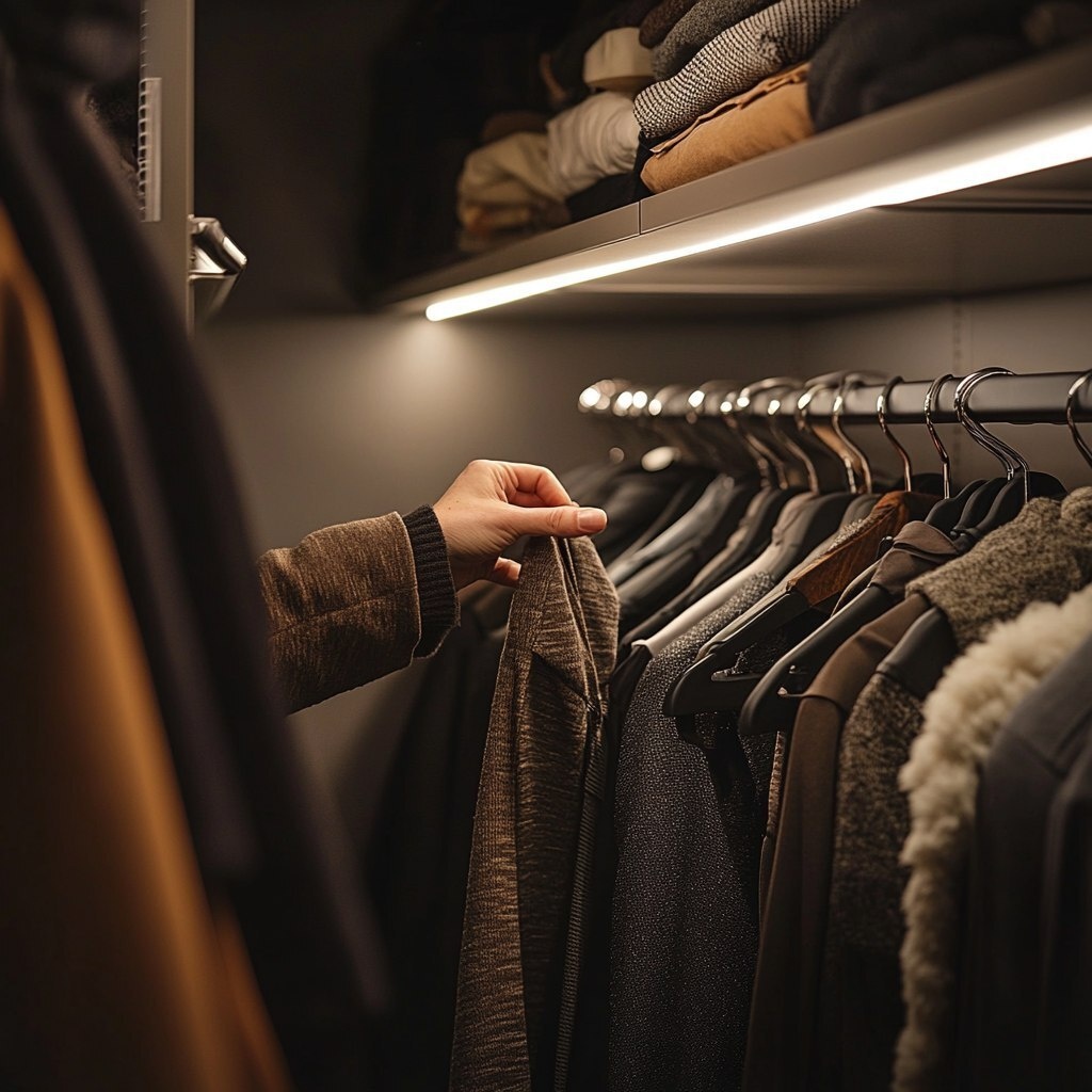 Создано на основе запроса: An adult inside a narrow walk-in closet, organizing clothes, one hand holding up a hanger, camera focus on the
