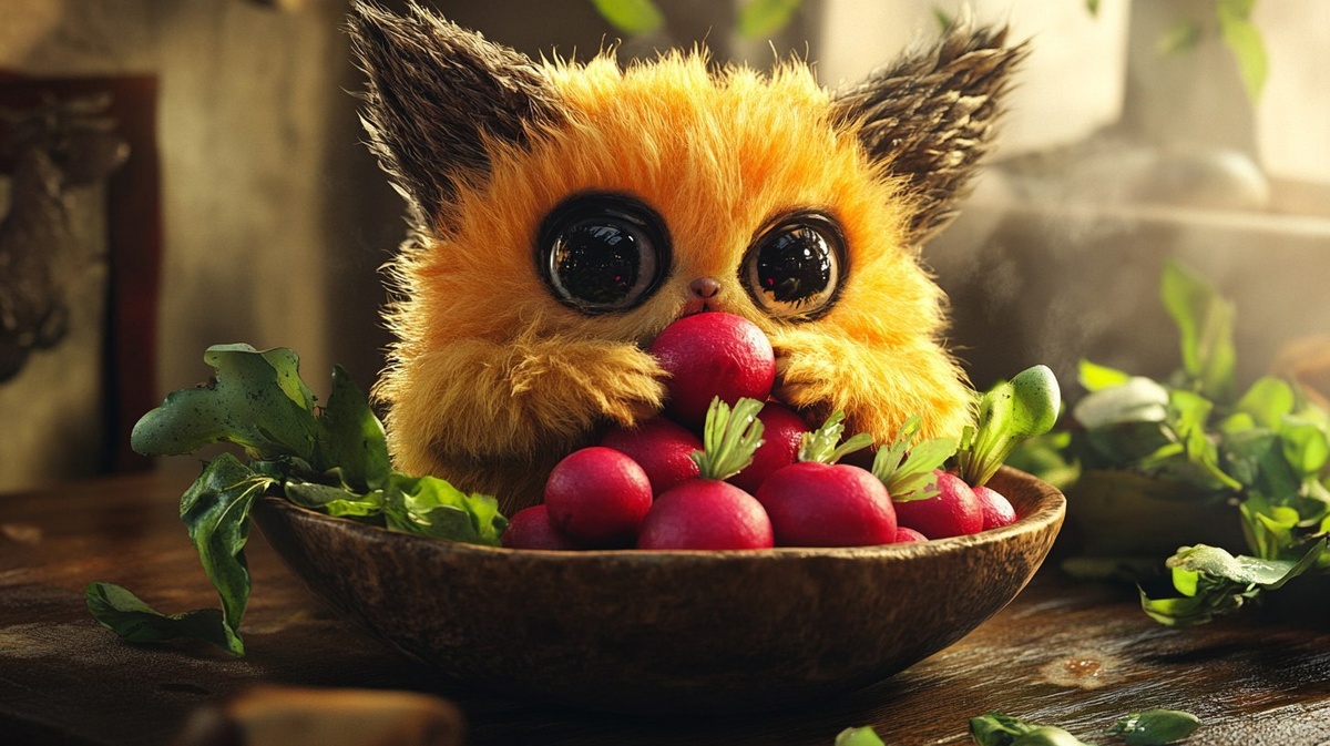 Создано на основе запроса: create a hyper realistic image of a furby eating a giant bowl of radishes