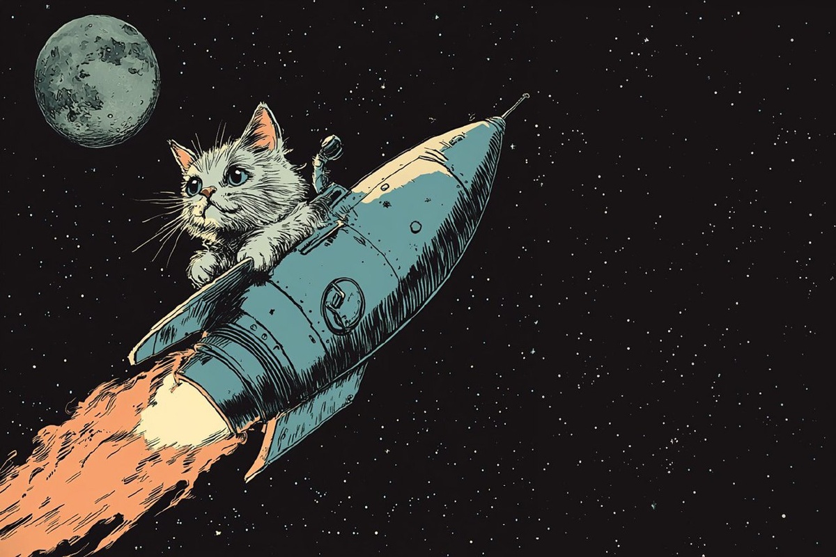 Создано на основе запроса: cat launching in a rocket to the moon, comic book graphic novel style