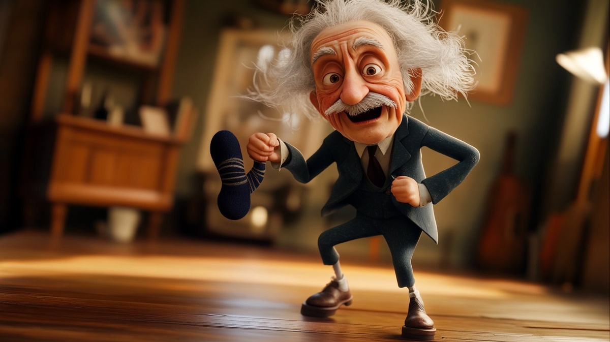 Создано на основе запроса: Albert Einstein dramatically tossing off his socks with a smug expression, exaggerated proud pose, messy hair