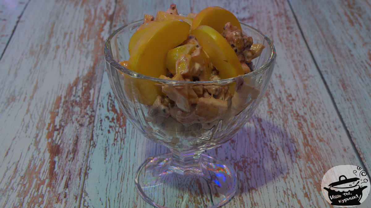 Ингредиенты: · яблоко - 1 шт.; · грецкие орехи - ½ ст.; · сметана - 1 ст.л.; · варенье ягодное - 1,5 ст.л. Приготовление: яблоко порезать на кубики, отложить 4 тонких дольки для украшения. Грецкие орехи порубить. Смешать яблоки, орехи, варенье и сметану, украсить дольками. Приятного аппетита!