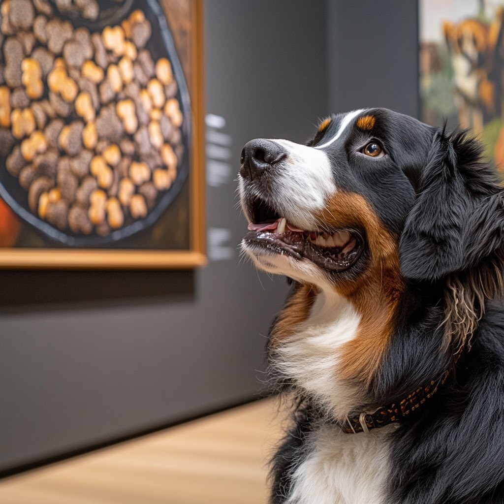 Создано на основе запроса: Real high-definition photo. A museum wall displays a painting of a dog food kibble. In front of the painting is an adult Bernese Mountain Dog looking up at the painting high on the wall. --- Автоперевод: Настоящая фотография высокой четкости. Хорошо выглядит? 🤔 https://dzen.ru/id/65c0c65c86e4f837c27b24d7 #ИИ #AI #нейросеть #midjourney #art