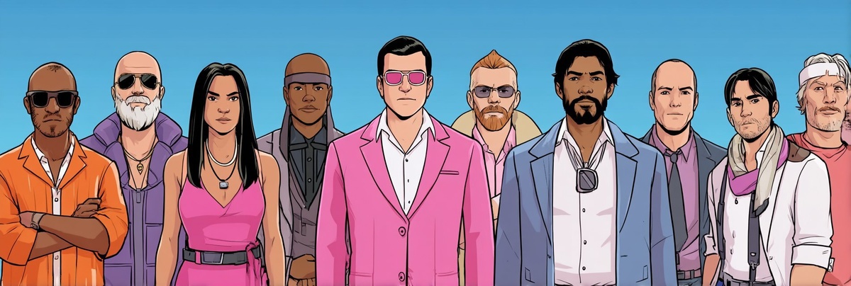 Создано на основе запроса: group of people related to crypto, famous crypto influencers like CZ, placed like in 2 rows vice city style