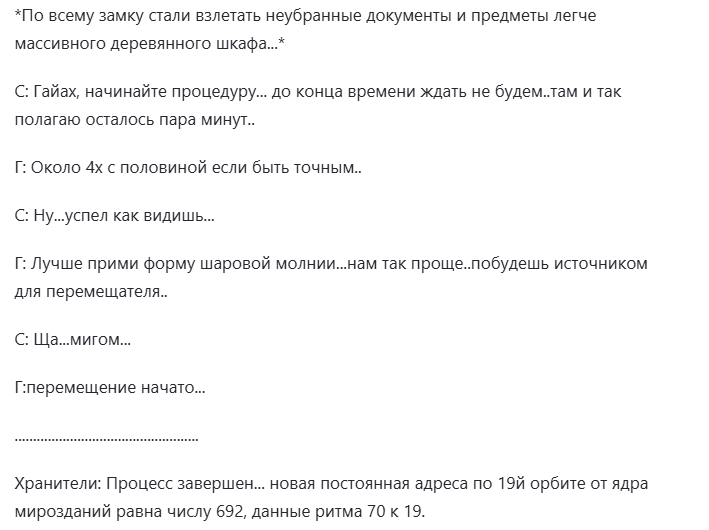 В старой версии *пространство ужимается до узкого клочка места вокруг врат....отключается реактор цитадели. Причем не по защите, они все выведены. Как и стержни до упора, даже магнитная защита отключена.. Недостаток топлива. Почти все выгорело, менее 10% осталось...Кусок отлетает куда то в сторону пространства Роновэ....кураторы переходят в последний момент в исходящий...канал закрывается...вспышка....разлетается старая версия врат...а следом и остаток мира. в труху..Дальше - я в цитадели на новом месте в нормальной форме. Произвожу перезагрузку престола.. Хранители меняют таймер...ну то что я писал...