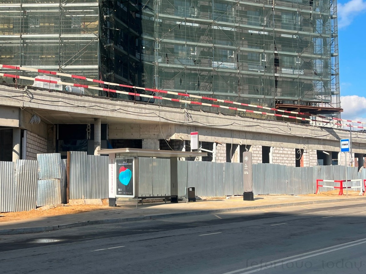 Остановка общественного транспорта Установленная, но еще не введенная в эксплуатацию остановка городского транспорта на улице Крузенштерна. На заднем плане видно строящееся здание на пересечении ул. Крузенштерна и бульвара Сенкевича. Источник: архив lefortovo_today