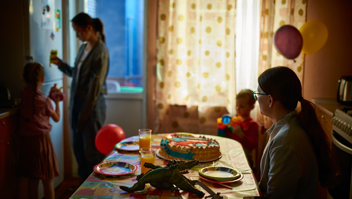 Настя поправляла гирлянду над кухонным столом, где уже громоздились миски с салатом «оливье» и тарелки с бутербродами. Сегодня Диме стукнуло семь, и она хотела, чтобы всё было как в детских мечтах: шарики, торт с динозаврами, куча друзей. В духовке шипел картофель с курицей, а из комнаты доносились звуки мультфильма про драконов, который Дима смотрел в десятый раз. Настя глянула на часы — полчаса до прихода гостей. Сердце ёкнуло: праздники всегда её напрягали. Слишком много суеты, слишком много шансов, что что-нибудь пойдёт не так.